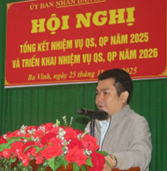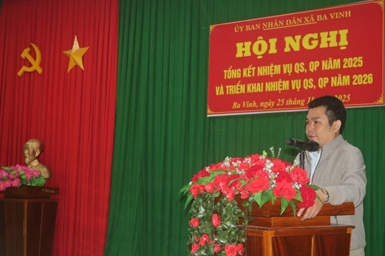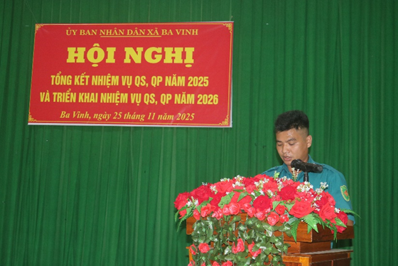 Sáng ngày 25/11/2025, tại Nhà văn hoá xã, Uỷ ban nhân xã Ba Vinh tổ chức Hội nghị tổng kết công tác quân sự, quốc phòng năm 2025 và triển khai nhiệm vụ năm 2026. Dự hội nghị có thiếu tá Phạm Thế Siêng – Trợ lý phòng không Ban chỉ huy phòng thủ Khu vực 5 Đức Phổ tăng cường Ban chỉ huy quân sự xã Ba Vinh; đồng chí Phan Quang Đức, Bí thư Đảng uỷ, Chủ tịch UBND xã Ba Vinh chủ trì hội nghị, đồng chí Phạm Văn Thoát, Uỷ viên Ban thường vụ, Trưởng Ban chỉ huy quân sự xã đồng chủ trìn Hội nghị.